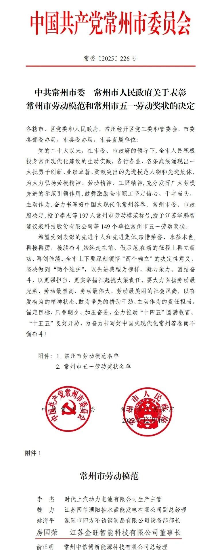 近日,江蘇金旺智能科技有限公司董事長(zhǎng)房國榮憑借其在農(nóng)化制劑智能制造領(lǐng)域的持續(xù)創(chuàng)新與突出貢獻(xiàn),在中共常州市委、常州市人民政府組織開展的先進(jìn)模范評(píng)選中,榮獲“常州市勞動(dòng)模范”榮譽(yù)稱號(hào)。常州市金壇區(qū)政府領(lǐng)導(dǎo)為房國榮董事長(zhǎng)現(xiàn)場(chǎng)頒發(fā)獎(jiǎng)?wù)屡c證書,表彰其作為企業(yè)帶頭人,二十年如一日推動(dòng)行業(yè)智能化轉(zhuǎn)型的卓越成就。