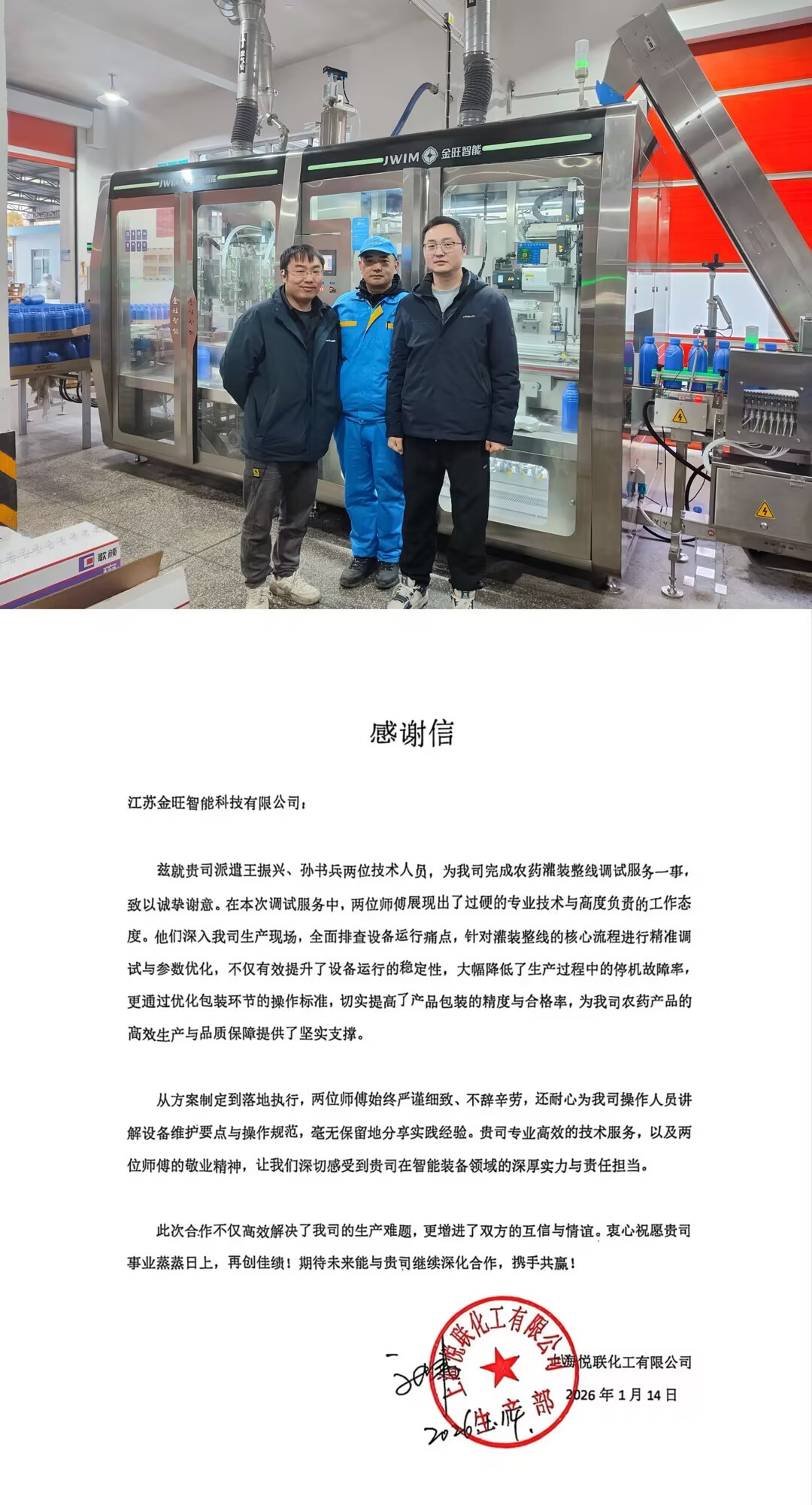 近日,上海悅聯(lián)化工有限公司向我司發(fā)來一封熱情洋溢的感謝信,對(duì)金旺技術(shù)團(tuán)隊(duì)的王振興、孫書兵兩位同事在項(xiàng)目中的卓越表現(xiàn),表示高度認(rèn)可與誠摯感謝。