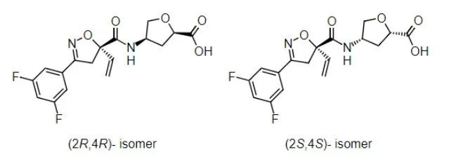 Icafolin的IUPAC名稱:(2RS,4RS)-4-({[(5S)-3-(3,5-二氟苯基)-5-乙烯基-4,5-二氫異噁唑-5-基]羰基}氨基)四氫呋喃-2-甲酸,含有40%~70%的(2R,4R)-異構(gòu)體和60%~30%的(2S,4S)-異構(gòu)體;CAS登錄號(hào):2254752-27-5;分子式:C17H16F2N2O5。