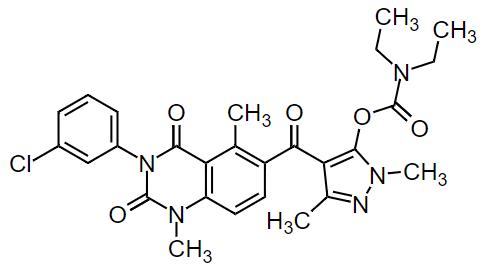 吡唑喹草酯的IUPAC名稱:4-{[3-(3-氯苯基)-1,5-二甲基-2,4-二氧代-1,2,3,4-四氫喹唑啉-6-基]羰基}-1,3-二甲基-1H-吡唑-5-基二乙基氨基甲酸酯;CAS登錄號(hào):2378093-62-8;分子式:C27H28ClN5O5。