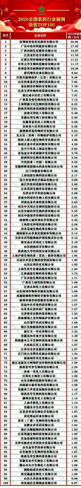 2020年全國農(nóng)藥行業(yè)制劑銷售TOP100中,深圳諾普信農(nóng)化股份有限公司以25.05億元的銷售額蟬聯(lián)榜首,廣東中迅農(nóng)科股份有限公司、廣西田園生化股份有限公司分別以17.32億元、13.07億元的銷售額位列第二、第三名。