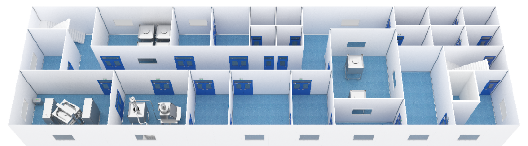 按照獸藥GMP標準及工藝流程,整個車間采用二層布局,一層包裝,二層物料加工和各種功能間。