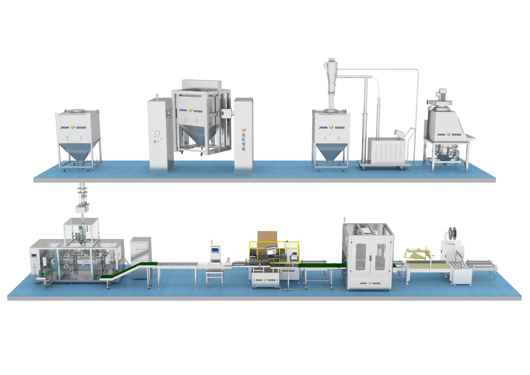 整個工藝流程從物料脫包、物料干燥、粉碎過篩、稱重配料、無塵投料、預(yù)混、轉(zhuǎn)運、自動包裝、檢測裝置、二維碼采集關(guān)聯(lián)、自動封箱打包、自動碼垛等設(shè)計,生產(chǎn)過程自動化程度高,降低企業(yè)用生產(chǎn)成本。